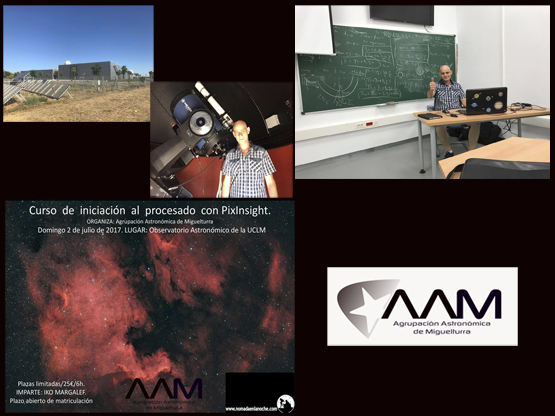 El domingo 2 de julio impartí un curso intensivo de iniciación al procesado con Pixinsight en el campus de la Universidad de Ciudad Real, el curso estaba organizado por la Agrupación Astronómica de Miguelturra y aunque estaba dirigido a Ellos, también estaba abierto al resto de aficionados de la zona. Realmente estoy muy agradecido a los chicos de la AAM por haber pensado en mi... Muchas gracias por darme la oportunidad de conocer vuestras preciosas tierras.