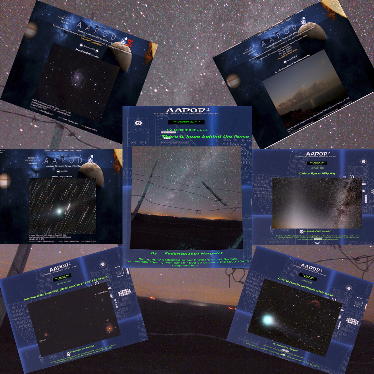 AAPOD es la foto astronómica amateur del día, a nivel mundial muchos astrofotografos aficionados enviamos nuestros trabajos y cada día una imagen es seleccionada como ganadora, he tenido la fortuna que 7 de mis astrofotos han sido ganadoras el 11/12/2011 mi primer AAPOD la Supernova 2011FE en la M51, el reflejo de Venus sobre el mar Mediterráneo el 08/10/2012, el Cometa C/2009 P1 Garradd el 27/05/2012, La Supernova Y el Cometa 2014R1 Borisov el 09/01/2015, la Luz Zodiacal vs Vía Láctea el 16/03/2015, el Cometa 2014Q2 Lovejoy y la Dolphin nebula Sh2-18 el día 10/05/2015, pero tengo que reconocer que el de mi foto dedicada a los refugiados Sirios "Detrás de la valla hay esperanza" el día 2 de diciembre del 2015 me emocionó.