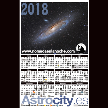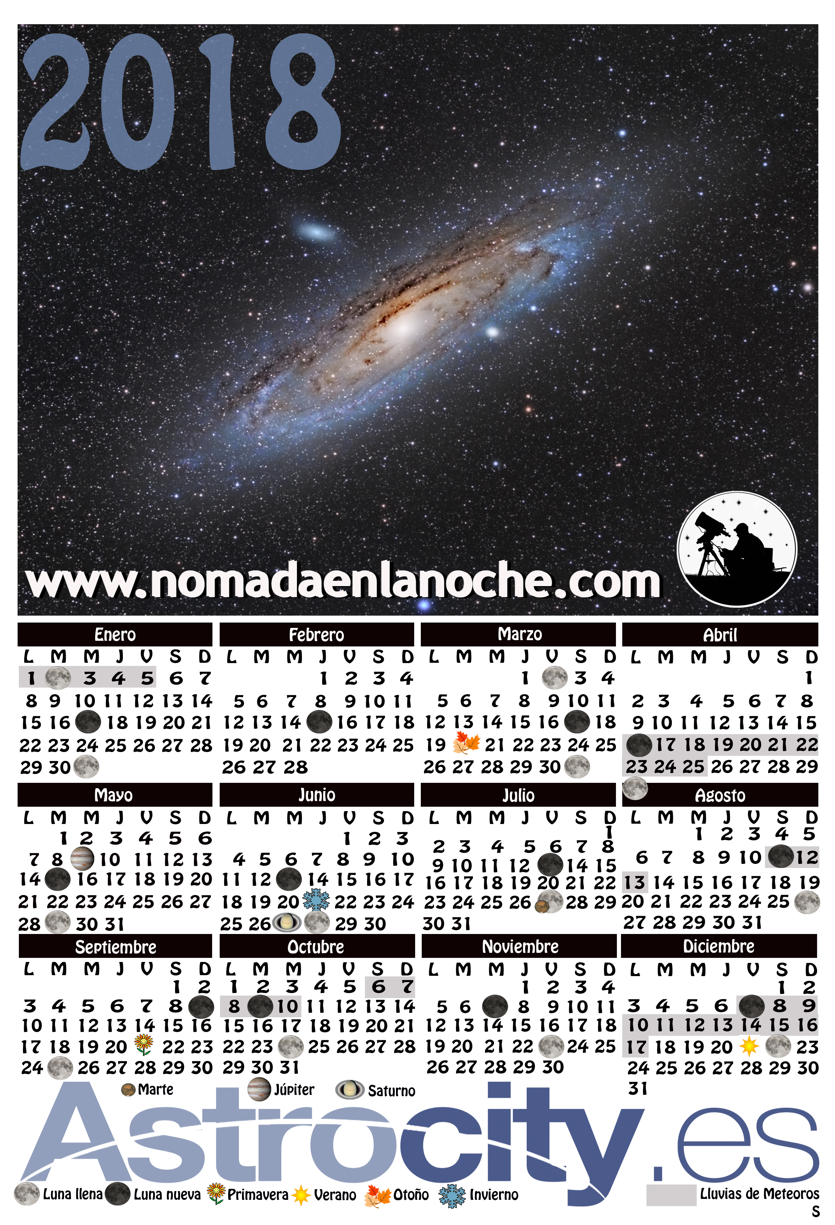 Este año 2.017 que acaba, ha sido realmente apasionante, en un viaje reciente vi que un amigo y compañero hizo un pequeño calendario de bolsillo, eso me dio la idea de hacer este para mi gente, qué sois todos vosotros y me sale del corazón agradecer a todos los que directa e indirectamente lo habéis hecho realidad y como muestra de agradecimiento pongo para libre descarga el Calendario Astronómico del 2018 que he hecho a una buena resolución, para qué lo podáis imprimir y colgarlo en el Observatorio o la nevera ;) , donde he señalado las efemérides Astronómicas que los aficionados a la Astronomía miramos asiduamente, pero sin saturar de información, he señalado las lunas llenas y nuevas, las lluvias de meteoros (lluvias de estrellas) más relevantes y las oposiciones de los Planetas principales de todo el año que viene, deseo que os guste y le deis utilidad, este nómada en la noche os desea unas felices fiestas y un maravilloso 2018 .