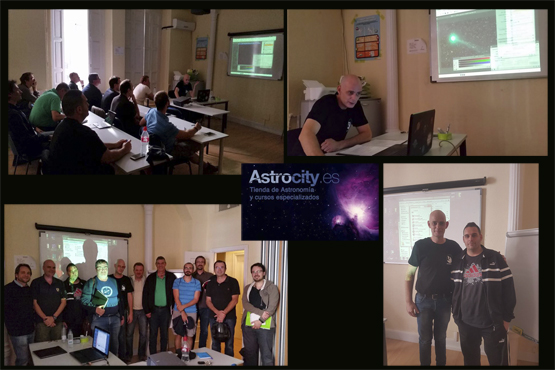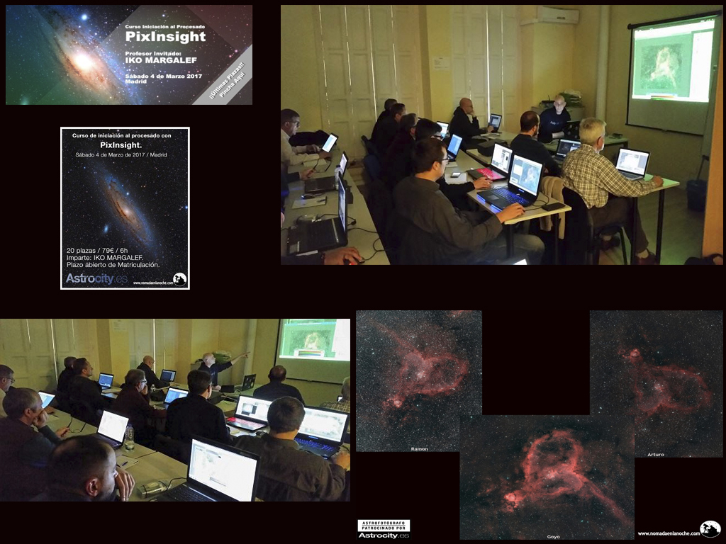 El sábado 4 de marzo del 2017 impartí un curso intensivo de iniciación al procesado de imágenes Astronómicas con Pixinsight para Astrocity.es, mi patrocinador. 6 horas donde procesamos en directo una imagen desde cero, comprendiendo todos los pasos. Fue muy gratificante ver los trabajos realizados por los alumnos, sabiendo que antes del curso no comprendían nada del programa (he puesto una muestra en el collage). Estoy muy agradecido a mi patrocinador Astrocity.es por todo, por haber pensado en mí para este curso y por apoyarme de la forma que lo ha hecho estos dos últimos años... máxima resolución AQUÍ