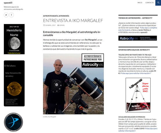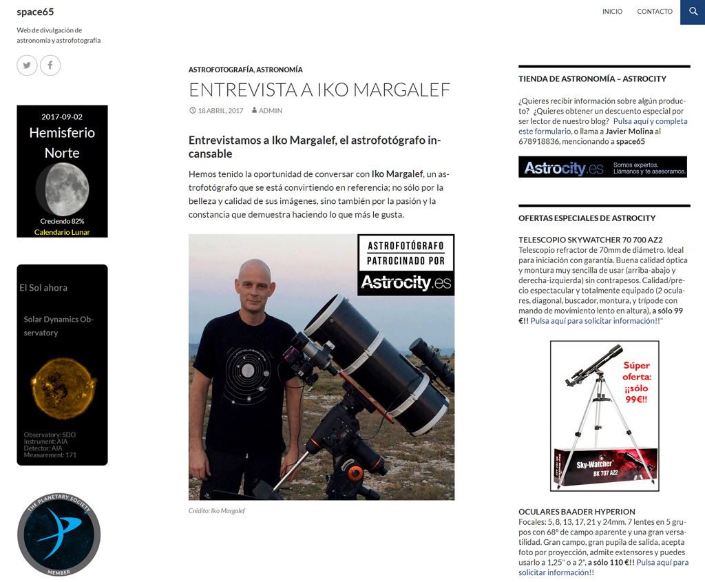 A principios del mes de abril, tuve una de las sorpresas más grandes de este año, y es que space65.es una magnífica web de divulgación de astronomía y astrofotografía me planteo hacerme una entrevista... Os aseguro que fue una sorpresa porqué nunca hubiera imaginado esto, a mí? en serio? pensaba mientras contestaba el cuestionario que recibí. Estoy muy agradecido a esta fantástica web tanto por la entrevista, porqué me permitió abrirme un poco más a muchas personas que siguen mí trabajo y a las que estoy eternamente agradecido, como por publicar muchas de mis actividades divuldativas. Podéis leer la entrevista completa AQUÍ
