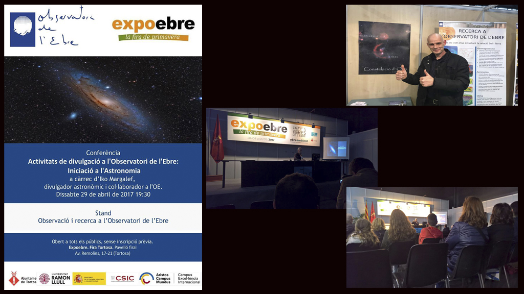 El pasado 29 de abril del 2017 di mi primera conferencia como divulgador del Observatori de l´Ebre fuera del complejo, fue en Expoebre una feria multi-sectorial a la que he asistido muchas veces de niño que se realiza en Tortosa (Tarragona) desde el 1944. Hablar de Astronomía en nombre del Observatori de l´Ebre es algo muy especial para mí y una gran responsabilidad, el OE es una gran institución con mucha historia de la Astronomía detrás y una referencia en mis tierras. Me siento muy agradecido por darme esta oportunidad.