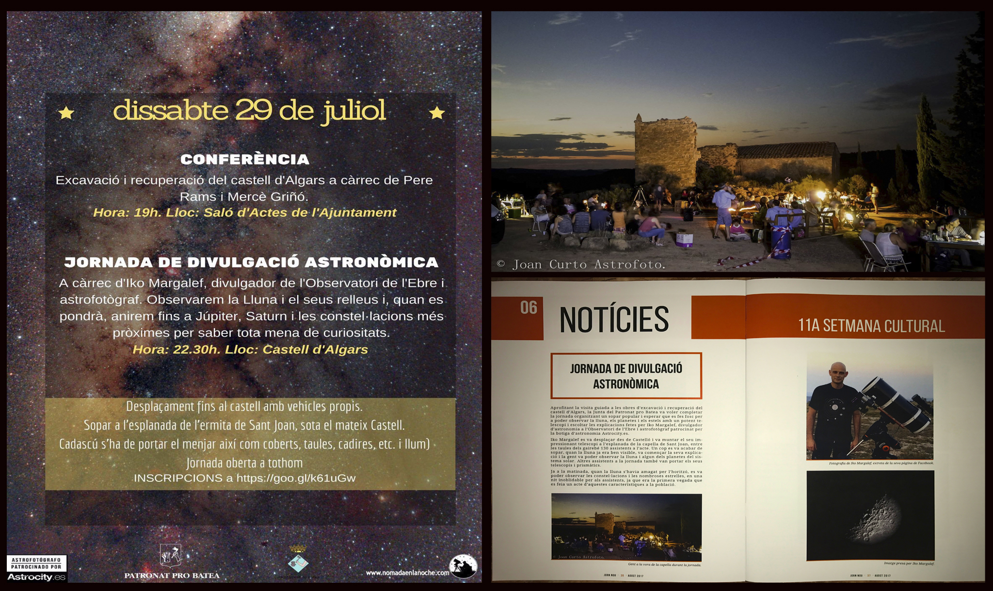 El pasado 29 de julio del 2017 tuve la oportunidad de ofrecer una noche de divulgación de la Astronomía bajo los magníficos cielos de Batea, Tarragona, organizado por el patronato pro Batea. La actividad comenzó con la presencia de la Luna en fase de cuarto creciente, mientras esperamos que la Luna se ocultara por el horizonte, las +/- 130 personas que se acercaron hasta el Castell d´Algars pudieron observarla por el telescopio que monté para la ocasión, después del ocaso de Selene y hacer una interpretación del firmamento y conocer las principales Constelaciones los asistentes pudieron observar el planeta Saturno y sus increíbles anillos, nebulosas y cúmulos estelares para terminar observando la gran Galaxia de Andrómeda. Al mes siguiente de realizar la actividad la revista local JORNNOU publicó una bonita reseña con imágenes del evento. Realmente estoy muy agradecido al patronato pro Batea por invitarme a compartir mi pasión en esta maravillosa localidad. máxima resolución AQUÍ