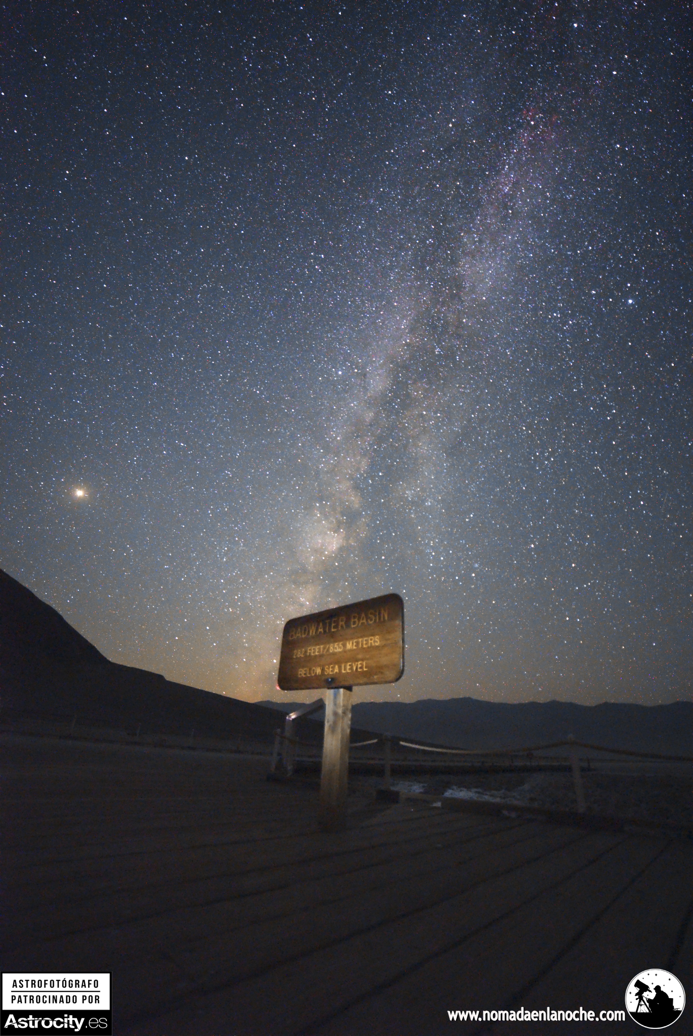 Estábamos saliendo del lugar donde habíamos hecho aquella foto, que se veían las Estrellas reflejadas en el agua salada, cuando mi amigo Rogelio Bernal me llevó a ver este cartel. Una vez allí, para pillar el encuadre del cartelito y la Vía Láctea de fondo, la posición era de lo más normal, tirados en el suelo para intentar que el cartel quedara por encima del horizonte, con mi amigo iluminándome el cartel..