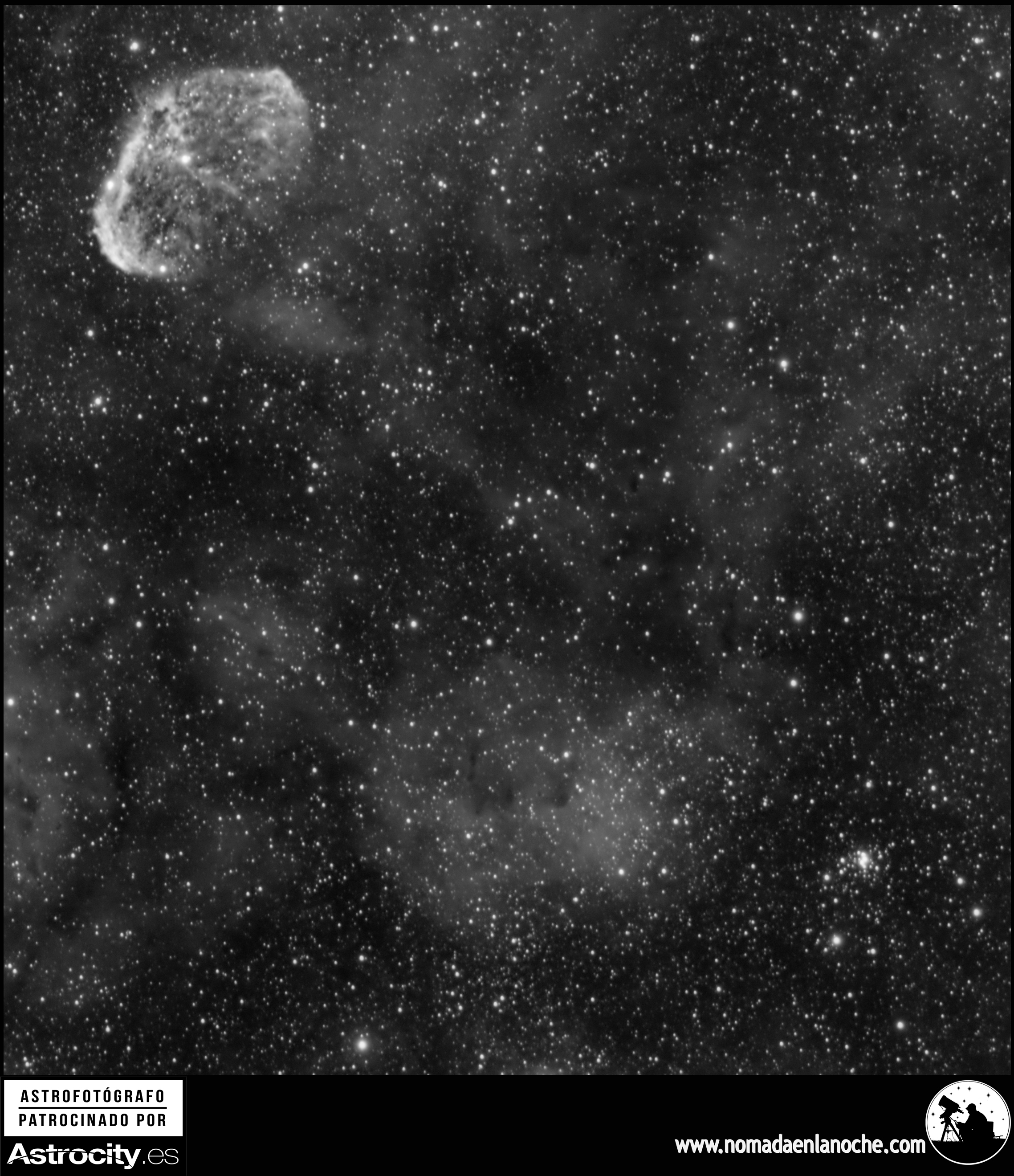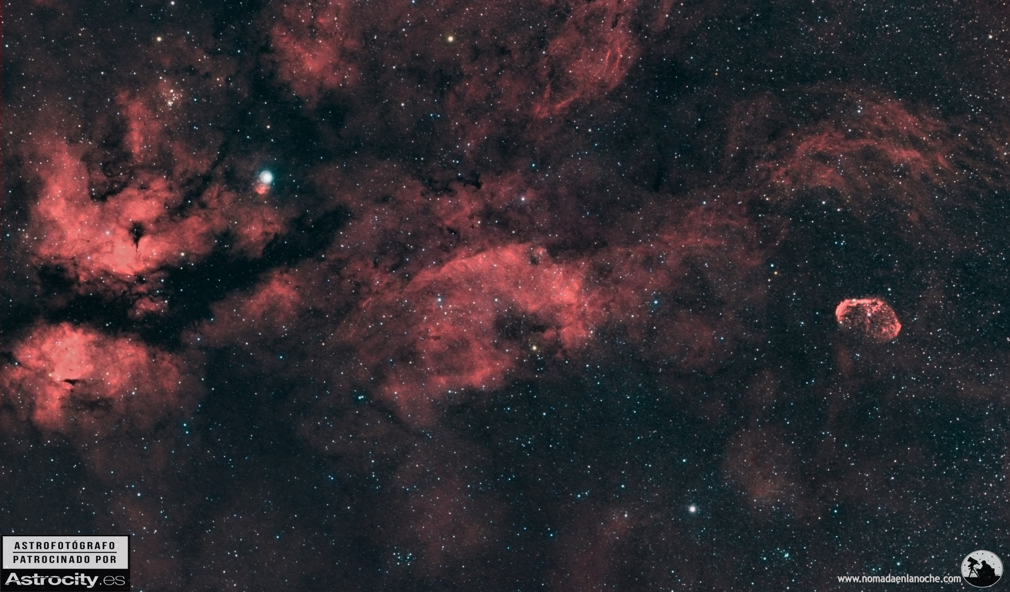 Y en la parte superior izquierda vemos la nebulosa Crescent o media Luna, un tipo de muerte estelar mucho más violento y convulso que el caso anterior.