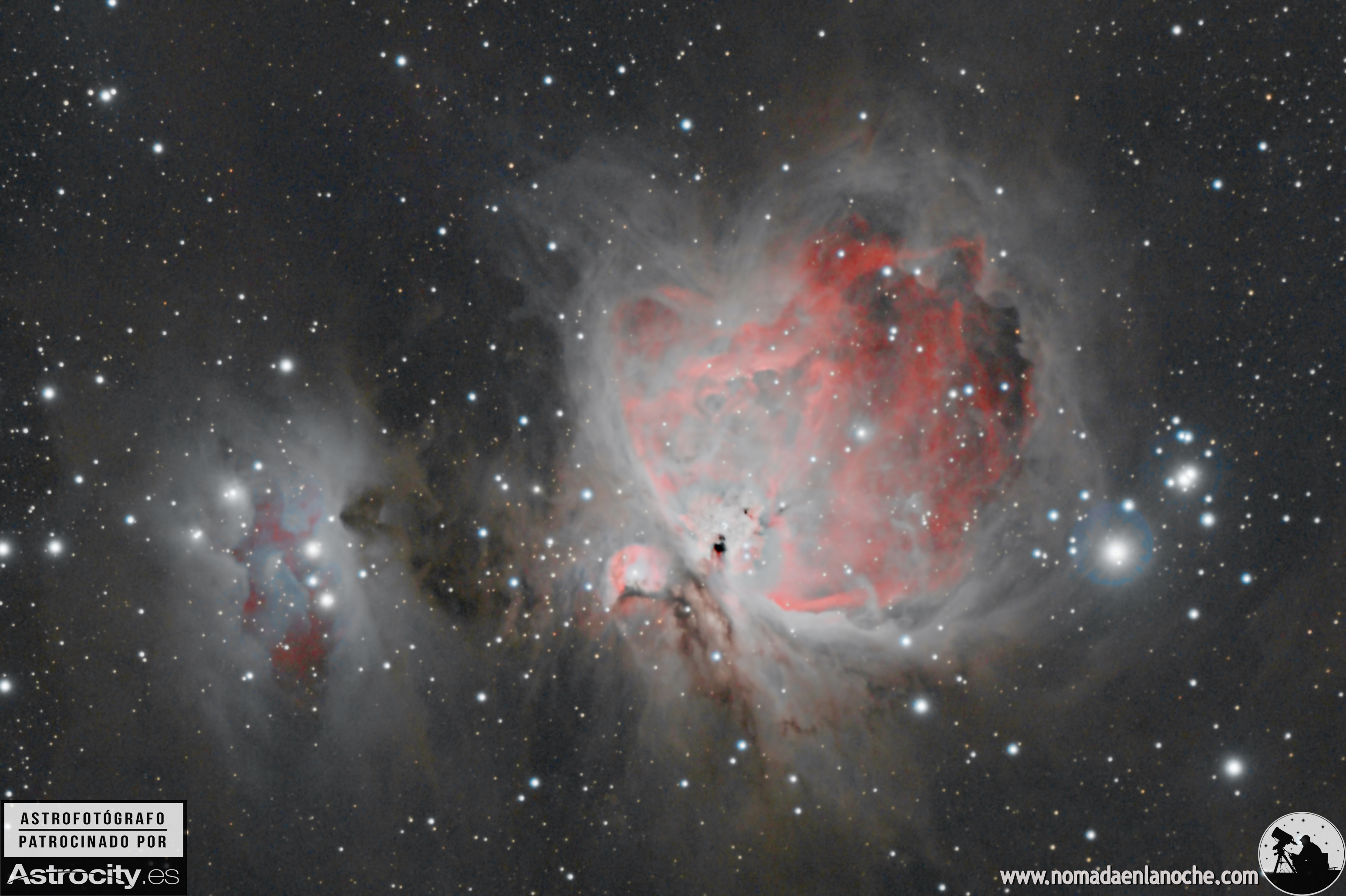 También conocida como espada de Orión o M42 en la constelación de Orión, situada a una distancia de +/-1300 años luz de nosotros. A la derecha de la imagen esta la Nebulosa del Corredor o Runing Man, un objeto muy débil en comparación con su gran vecina que sinceramente me fascina. La Gran Nebulosa es un objeto tan brillante que es capaz de verse a simple vista bajo un cielo negro y ser una auténtica delicia observarla con casi cualquier telescopio. Realizada en Cabo de Gata (Almería) la imagen HDR es la integración de 150x2"+150x8"+100x30"+100x60"+55x300"+25x600" con la canon 550D ISO3200 a -5ºC y el TS65Q . Imagen a máxima resolución AQUÍ