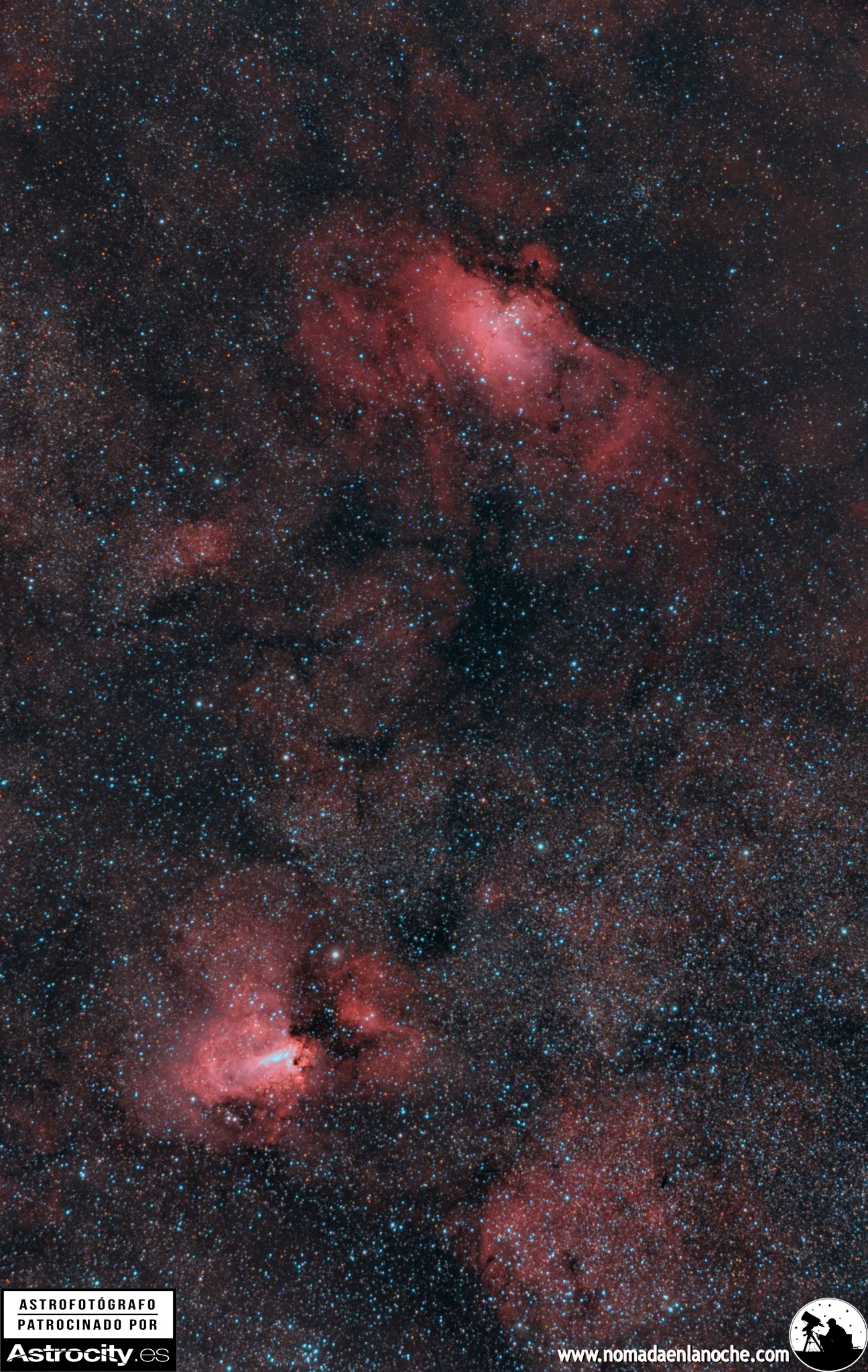 La Nebulosa del Águila o M16 en la parte superior de la imagen, está conformado por la nebulosa y un cúmulo estelar abierto asociado con ella. Situada, a una distancia de 7.000 años luz. En una parte de la nebulosa están los famosos "pilares de la creación", que forman una de las imágenes más populares de las obtenidas por el telescopio espacial Hubble. En la parte inferior podemos observar la nebulosa Omega o M17, situada en la constelación de Sagitario a una distancia de entre 5.000 y 6.000 años luz. La imagen es la suma de 25 tomas de 180 segundos RGB ISO 8000 con la Astro-Sony A7s (Central DS) y el telescopio refractor TS-65Q Recomiendo verla a máxima resolución AQUÍ o click en la imagen