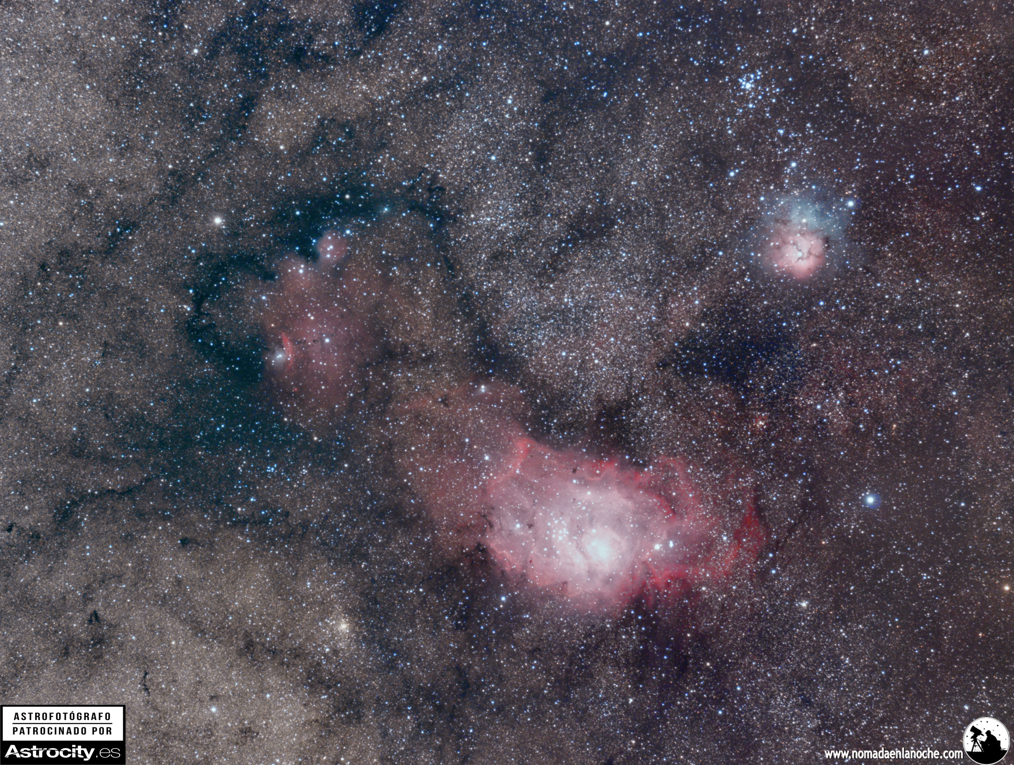 Nebulosas Laguna o M8 y Trífida o M20, situadas en la constelación de Sagitario pero separadas entre sí por 500 años luz, estando la M8 (izquierda) a 5.000 años luz y la trífida (derecha) a 5.500. De la Nebulosa de la Laguna destacar que estas "manchas negras que aparecen dentro y alrededores" son glóbulos de Bok, nubes de gas y polvo en proceso de colapso para formar estrellas. La realicé a modo de prueba pero me gustó el resultado, hecha en el Mas de Muxacre, Morella, Castellón (Spain).Integración de únicamente 20 tomas de 120 segundos con la Astro-Sony A7s (Central DS) ISO12.800 y el telescopio refractor TS-65Q Imagen a máxima resolución AQUÍ