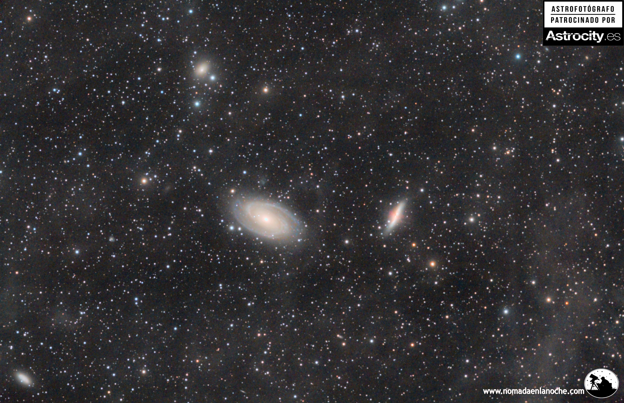 Galaxias M81, M82 situadas a un distancia de 12 millones de años luz en la constelación de la Osa Mayor. Y la Nebulosa de flujo integrado o IFN, una débil y difusa nebulosa de reflexión que no está iluminada por ninguna estrella como el resto de Nebulosas que se encuentran en el plano de nuestra Galaxia, si no por la energía del flujo integrado de todas las estrellas de la Vía láctea. La imagen es una integración de 45 tomas de 600 segundos con la canon 550D ISO3200 y el telescopio TS65Q . Imagen a máxima resolución AQUÍ
