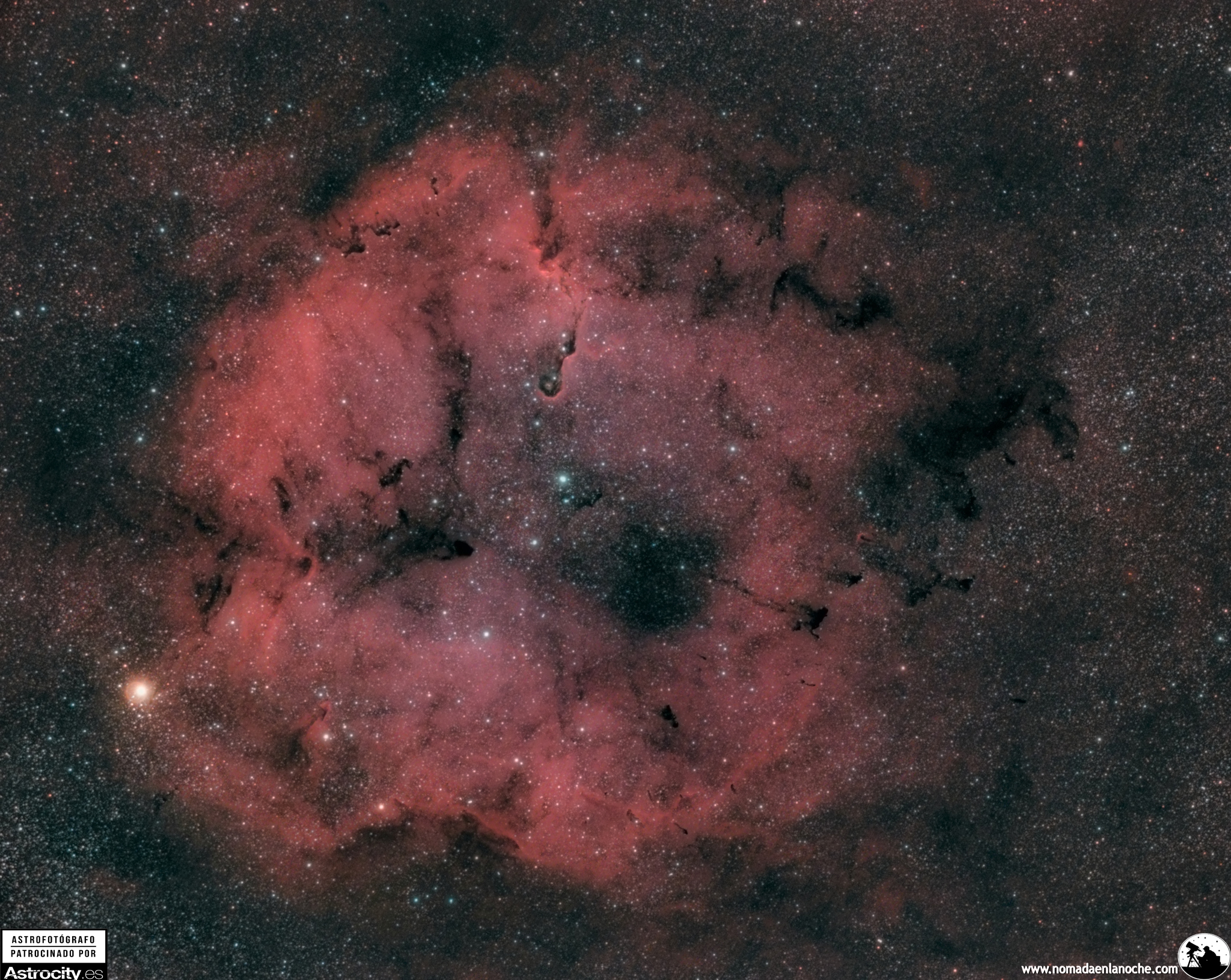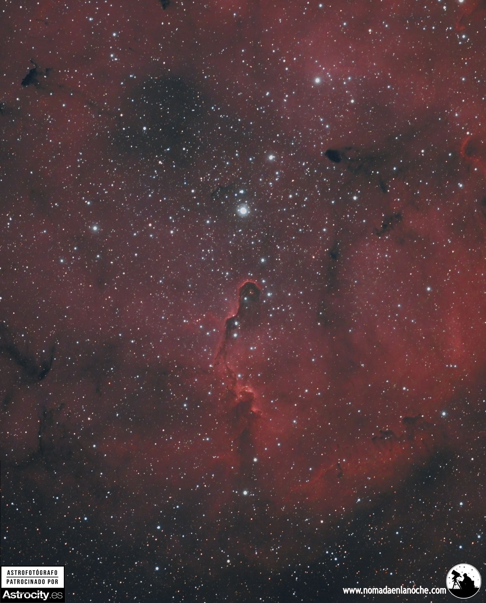 Ic 1396 en la constelación de Cefeo, situada a una distancia de 3.000 años luz el cúmulo de estrellas jóbenes ioniza esta gran región rica en hidrógeno alfa que abarca unas 6 lunas llenas. La Nebulosa Trompa de Elefante es la más conocida de todo el conjunto con su caprichosa forma. Esos glóbulos oscuros que se ven en la imagen son glóbulos de Bok, grandes nubes de hidrógeno y otros materiales como silicatos que daran lugar al nacimiento de nuevas estrellas y planetas. Imagen realizada en Nerpio,Albacete (Spain) es la integración de 50 tomas ISO6400 con la Astro-Sony A7s (Central DS) y el telescopio refractor TS-65Q Recomiendo verla a máxima resolución AQUÍ o click en la imagen