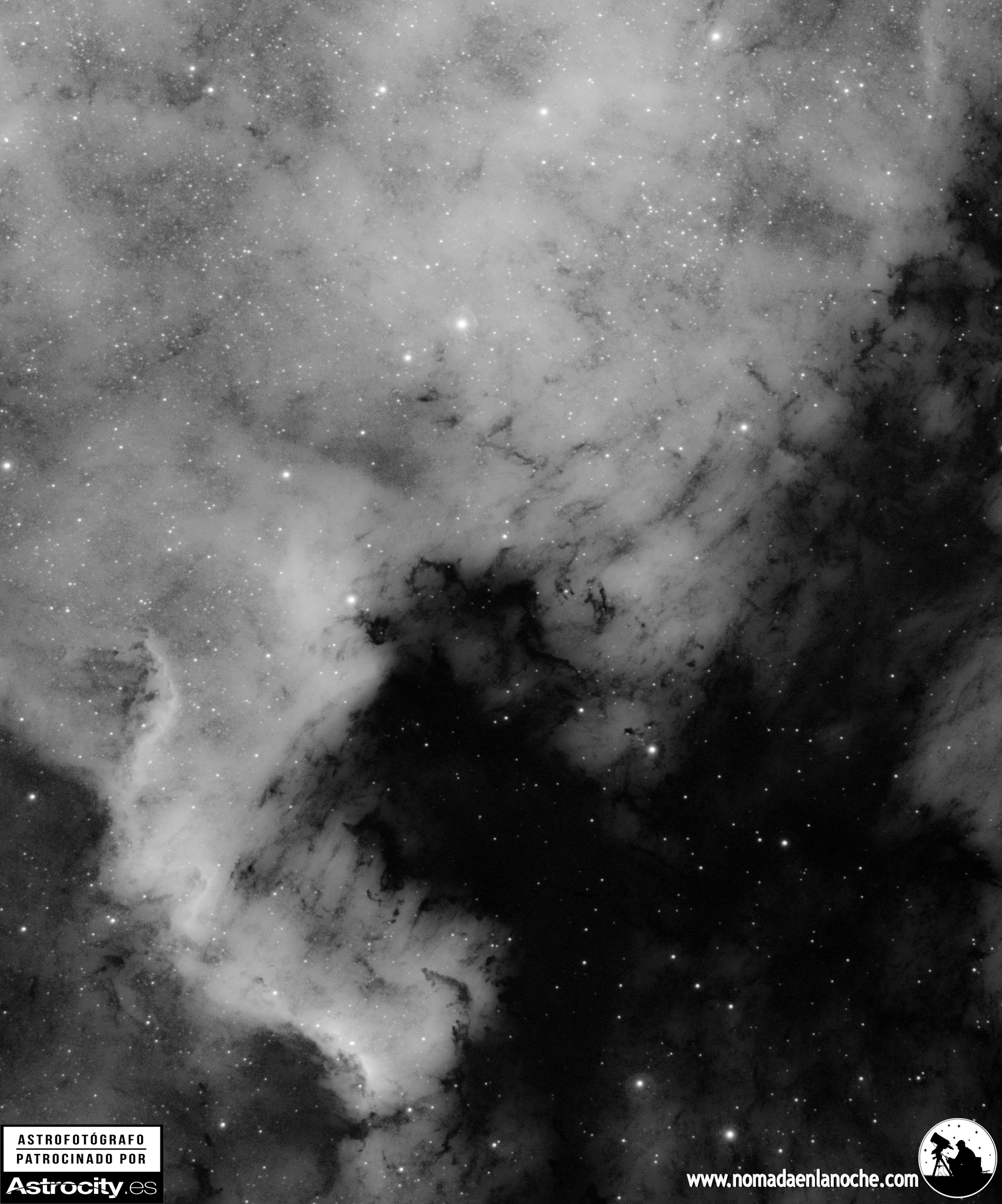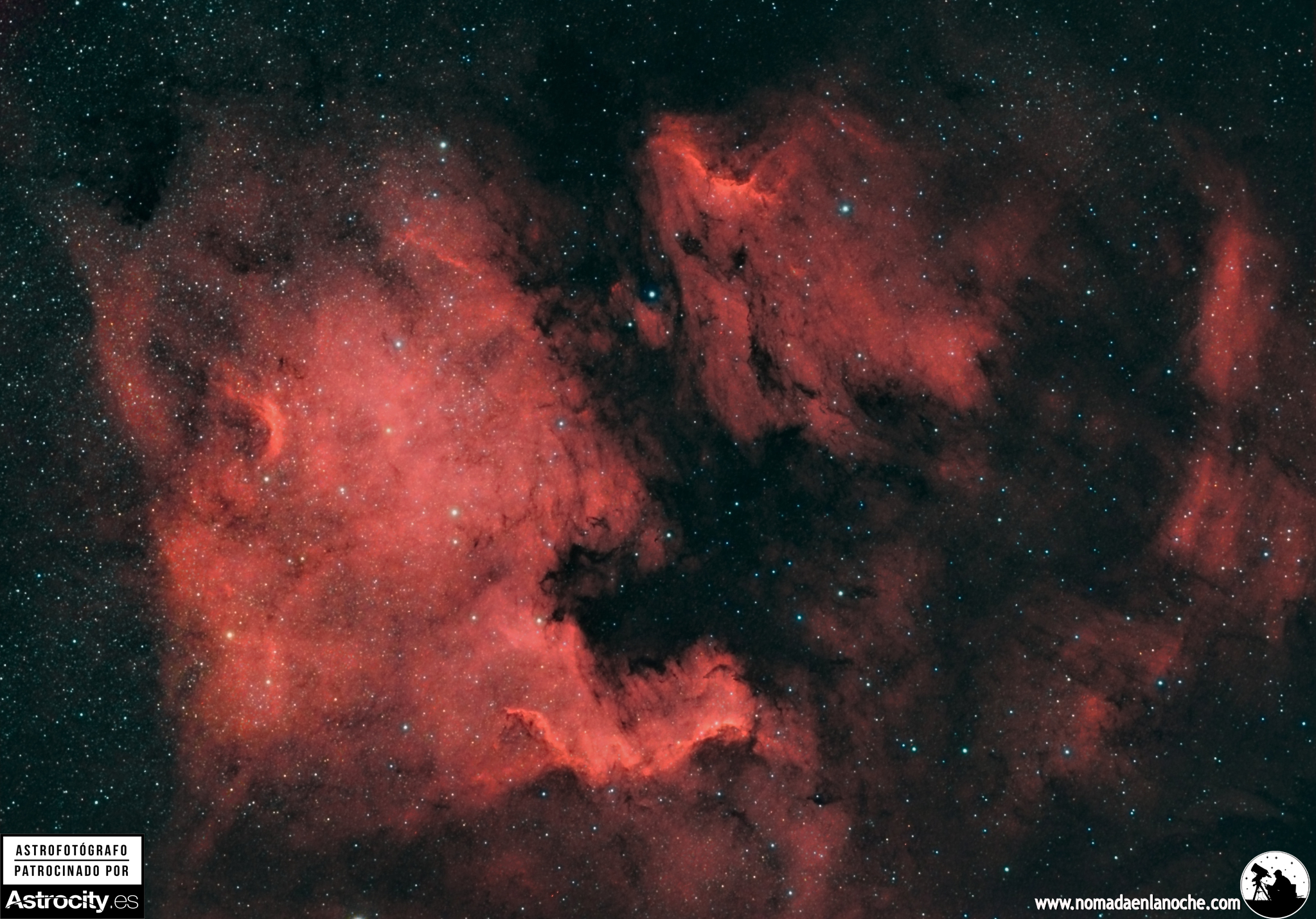 Parte de la nebulosa Norteamérica, 15 tomas de 500 segundos con la ASI1600mm y el filtro Baader H-alpha 7nm, con el telescopio TS65Q sobre la Celestron CGEM máxima resolución AQUÍ o click en la imagen