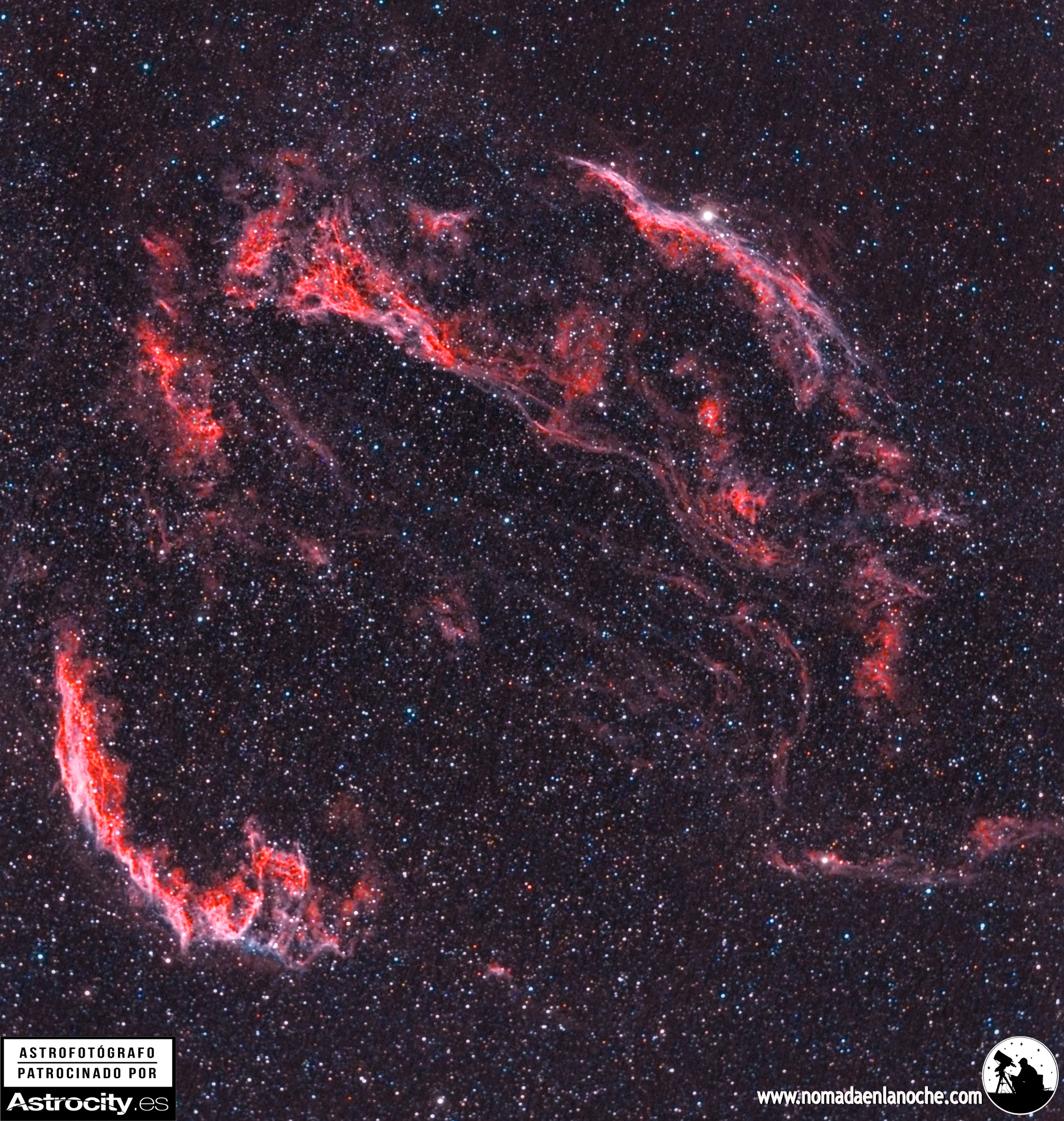 La Nebulosa del Velo es un remanente de supernova situado en la constelación del Cisne, situado a una distancia de 1.470 años luz. La Estrella masiva explotó hace entre 5.000 y 8.000 años esparciendo sus materiales por una enorme área del cielo, de aproximadamente el tamaño de 6 Lunas llenas. Realizada en el Mas de Muxacre, Morella, Castellón (Spain).Integración de únicamente 10 tomas de 240 segundos RGB y de 40 de H-alpha con la Astro-Sony A7s (Central DS) ISO12.800 y el telescopio refractor TS-65Q Imagen a máxima resolución AQUÍ