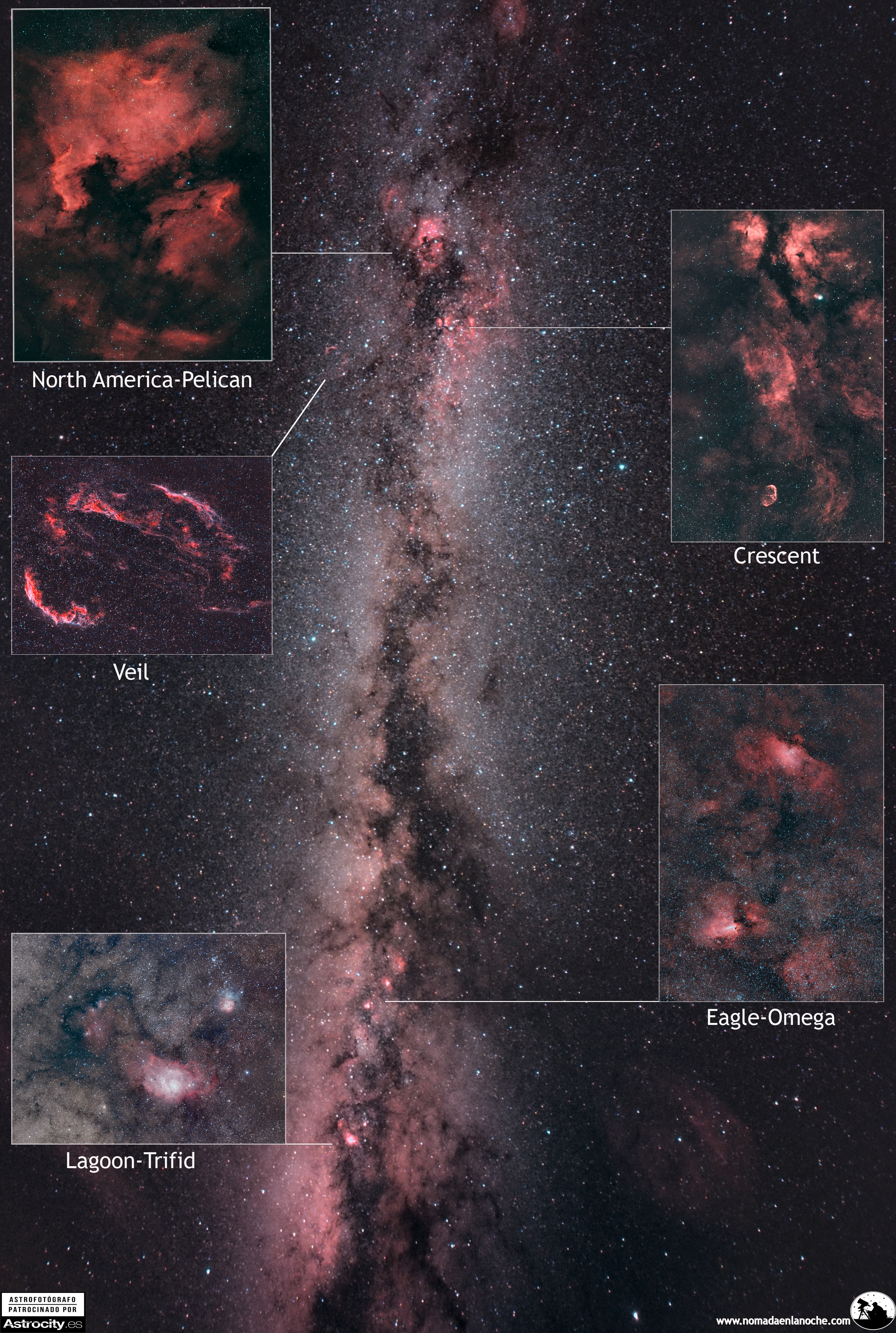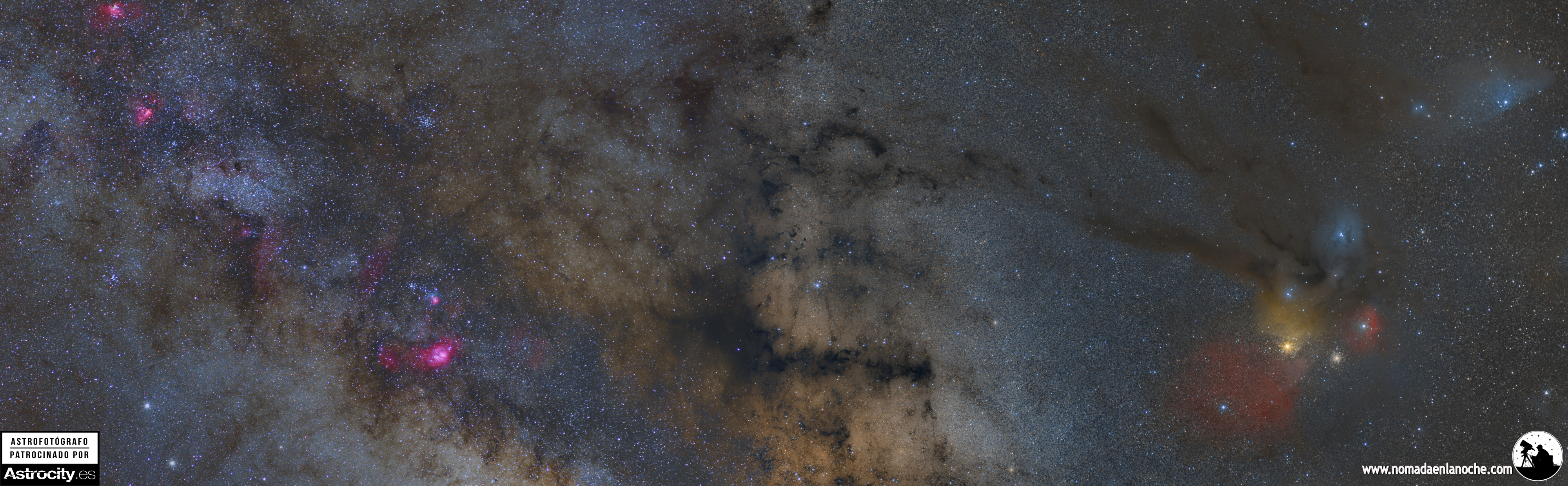 Una imagen donde podemos observar un surtido variado de Nebulosas, que nos ofrecen diferentes maneras de ver enormes nubes moleculares que se encuentran en nuestra Galaxia y que nos ofrecen un bonito espectáculo de colores en nuestro cielo profundo. Esos diferentes colores se deben a que diferentes procesos hacen brillar el gas circundante, las azules por ejemplo y generalizando son nebulosas de reflexión brillan porqué refleja la energía procedente de una o más estrellas cercanas, las rojas brillan en virtud de la ionización del gas que la compone y las más oscuras porqué no dejan pasar la luz de fondo...