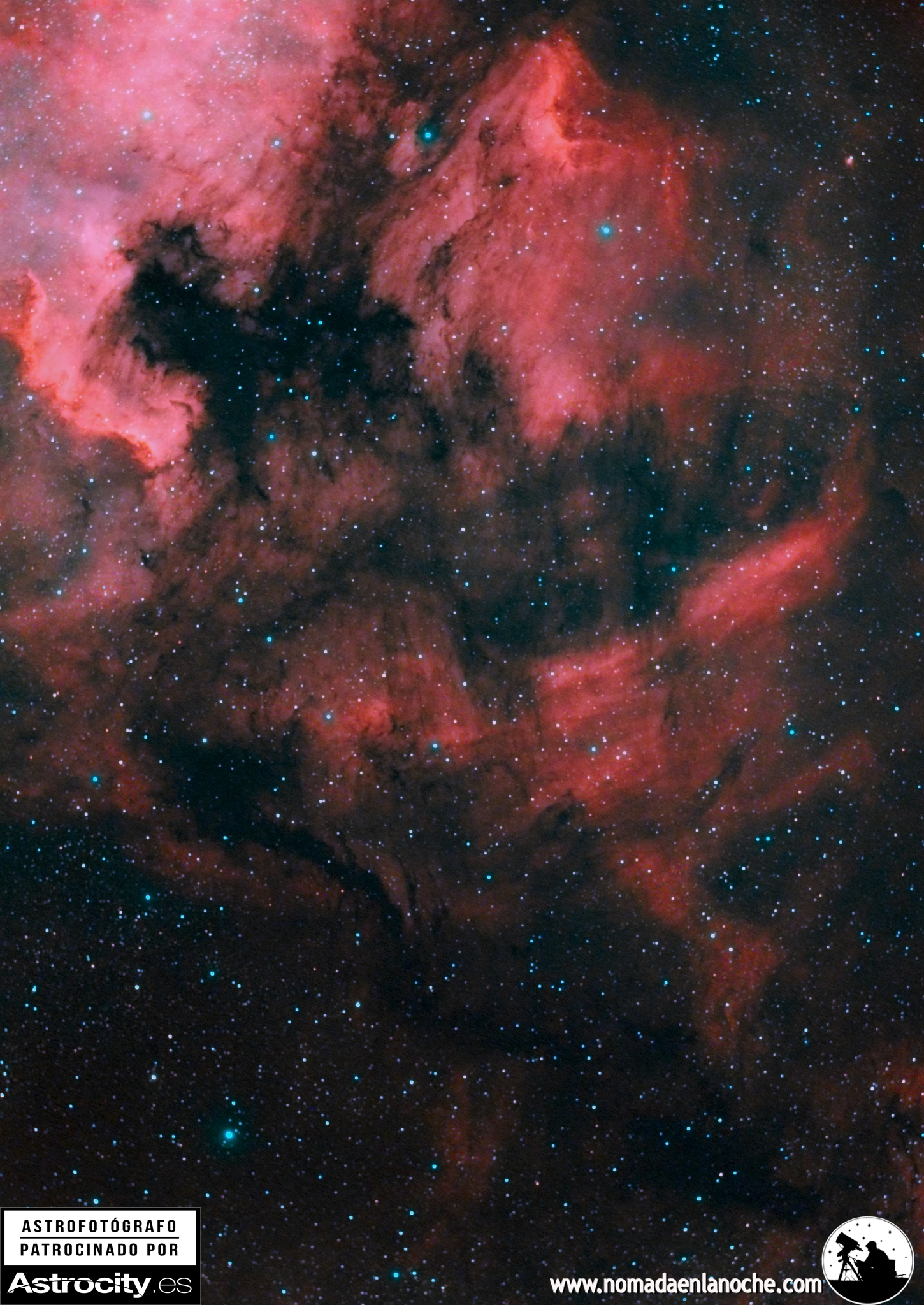 La Nebulosa Pelícano o IC 5067 es una nebulosa de emisión en la constelación de Cygnus en la parte superior de la foto, este encuadre fuera de lo común lo hice buscando sacar la nebulosidad de la parte inferior al Pelícano, como no he encontrado el nombre de esta nebulosidad y podría parecer su nido, me he tomado la licencia de titular la imagen así (espero no se enfade nadie). Es la integración de 25 tomas de 180 segundos RGB ISO 8000 y de 23 de 180 ISO 12.500 H-alpha con la Astro-Sony A7s (Central DS) y el telescopio refractor TS-65Q Imagen a máxima resolución AQUÍ