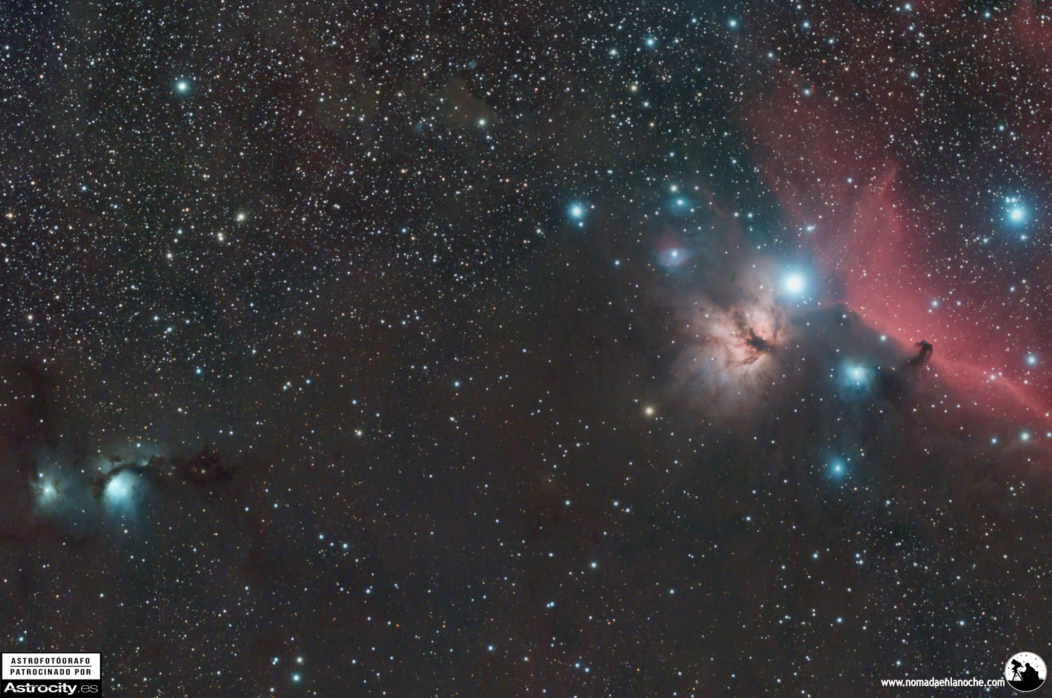 En la imagen se pueden ver muchas nebulosas de esta famosa Constelación invernal. Comenzando por la izquierda la Nebulosa difusa de reflexión M78 o Ngc 2068, en la parte derecha están las Nebulosas Cabeza de caballo y la Flama como más destacadas, la estrella más brillante que se ve en la imagen situada a la izquierda de la Cabeza de Caballo es la estrella Alnitak situada al sur del cinturón de Orión.