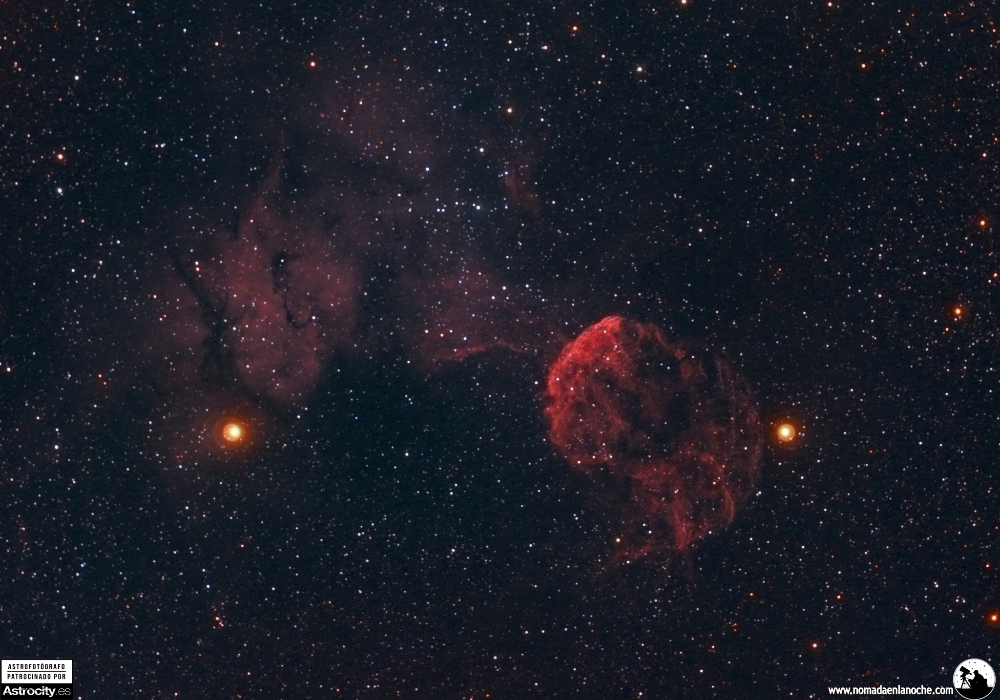 Aunque a primera vista pueden parecer parte de la misma Nebulosa, en realidad se trata de dos objetos completamente diferentes... La Nebulosa de la Medusa es un remanente de Supernova situado a 5.000 años luz de la Tierra, los restos de una estrella que estalló hace unos 30.000 años. En la parte izquierda de la imagen está la Nebulosa de emisión Sharpless 249, la diferencia entre esta y la Medusa es que esta brilla por la energía recibida de estrellas cercanas.
