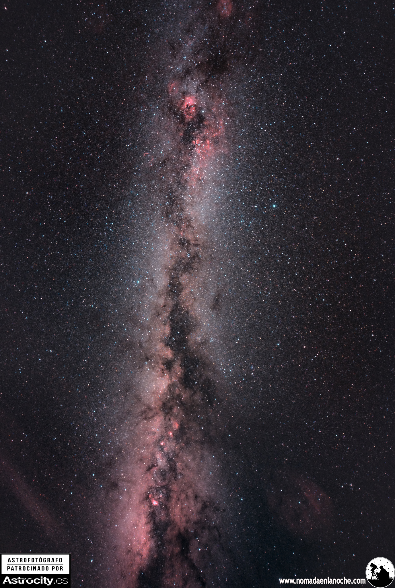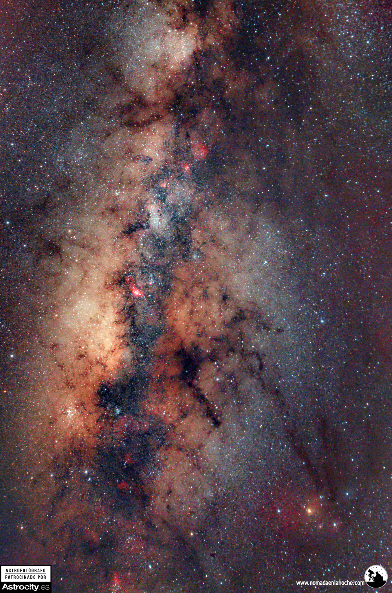 Zona central de nuestra Galaxia la Vía Láctea, cuando miramos a la parte más brillante del cielo nocturno estamos mirando hacia el centro de nuestra Galaxia del que nos separan unos 26.000 años luz. En la imagen hay varias Constelaciones pero sinceramente cuesta distinguirlas entre tanta estrella, también muchas de las nebulosas típicas del verano. Abajo a la derecha se puede apreciar la zona de la estrella Rho Ophiuchi, envolviendo a esta existe una brillante nebulosa de reflexión originada por la luz estelar que es dispersada por una nube de polvo interestelar. Alrededor de esta nebulosa hay enormes y oscuras nubes no iluminadas que se extienden como filamentos 100 años luz al este, en dirección a la constelación de Sagitario.. Imagen realizada en verano del 2016, es la integración de 20 tomas de 180 segundos con la canon 550D ISO1600 y un objetivo Sigma 10-20 a 20mm máxima resolución AQUÍ o click en la imagen